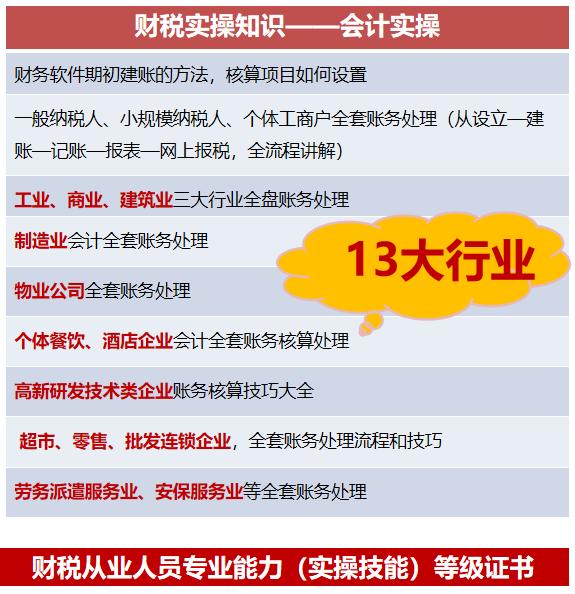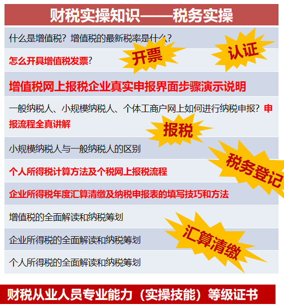 中级(专业级):主要面向有相应专业背景或财税业务经验的人员,面向出纳、会计核算、财务专员、税务专员、统计员、审计专员等工作岗位(群)进一步提升财税实操能力及职业价值,向专业技能人才发展;