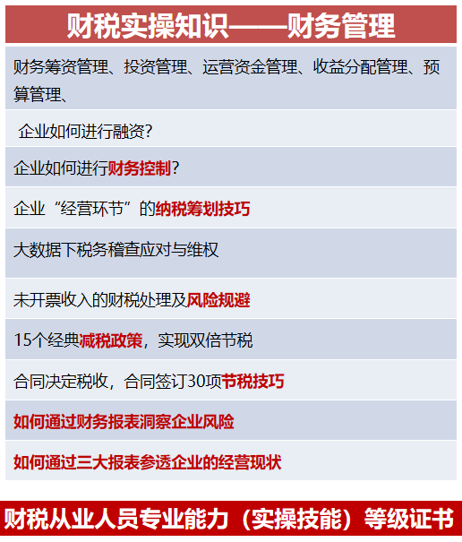 高级(资深级):主要面向有专业背景及财税业务经验的人员,如:财务主管、税务主管、主办会计、财务经理或财务分析等管理工作岗位(群)人员或向业财融合与财务规划及财务管理等方向发展的财税管理人才。